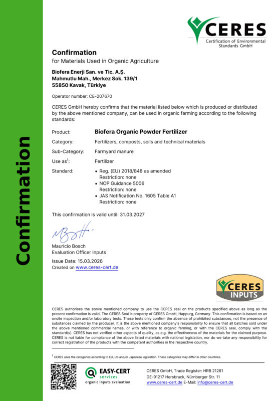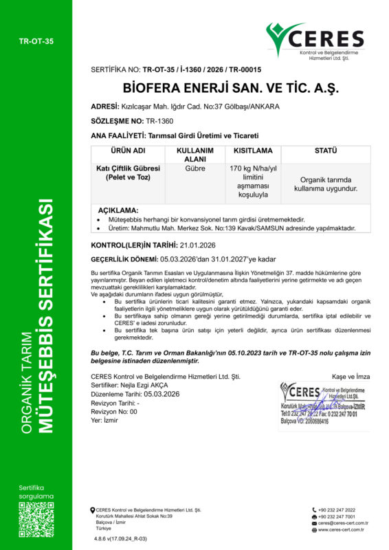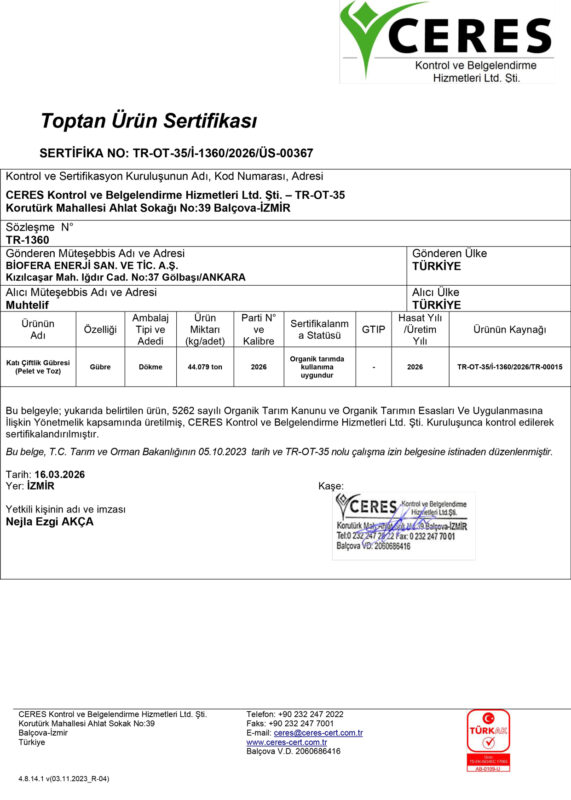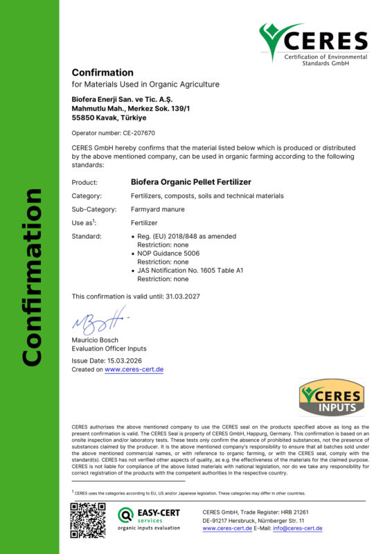 Ceres Pelet Organik Sertifikası
